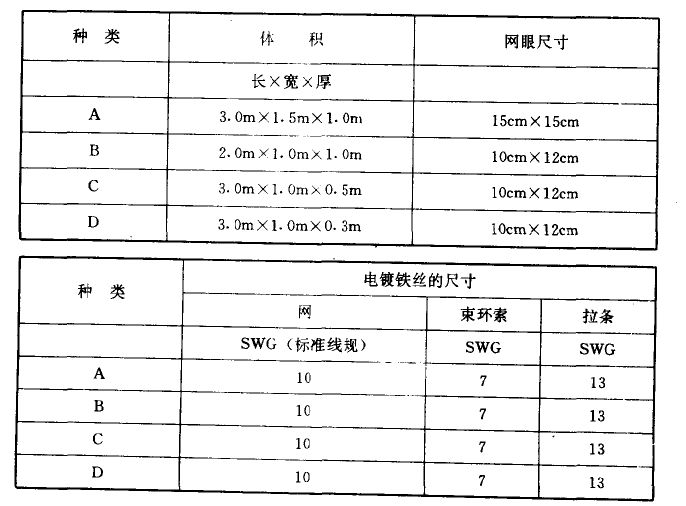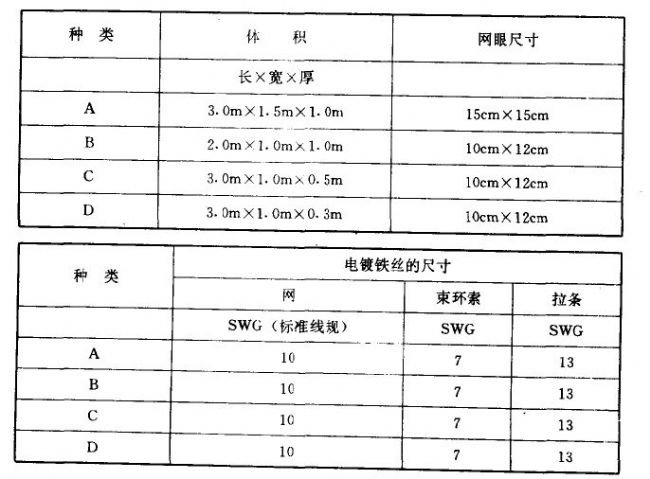 多數水力結構的防洪堤及下游漸變部分將部分地或全部地依照圖紙所示或工程師的指示用石籠墊加以防護,根據尺寸的不同下表列出4種石籠墊。