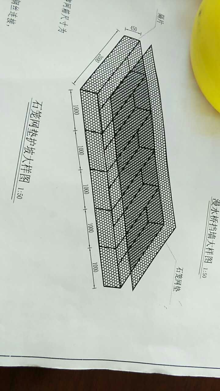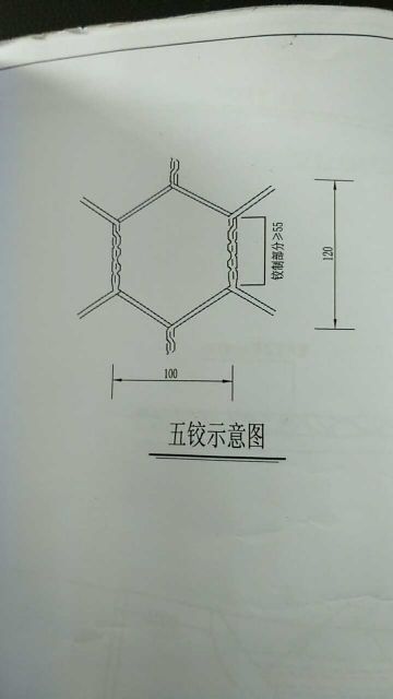 格賓網(wǎng)箱網(wǎng)片采用五絞工藝,五絞網(wǎng)目:100×120mm,絞制部分長度不得小于55mm,網(wǎng)片采用高爾凡鋼絲制造,網(wǎng)絲直徑為2.5mm,邊絲直徑為3.0mm,扎絲直徑為2.2mm,網(wǎng)箱間采用鋼絲連接。連接綁扎用的組合絲、螺旋固定絲及水平拉力絲必須與網(wǎng)絲同材質(zhì),組合絲綁扎必須是雙絞線并絞緊,螺旋組合絲綁扎必須絞繞收緊,端網(wǎng)框線與網(wǎng)shen交接處必須采用螺旋組合絲絞繞收緊聯(lián)結(jié)。