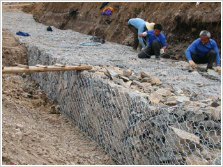 (4)鋅-5%鋁-混合稀土合金鋼絲包塑:在鋅-5%鋁-混合稀土合金鋼絲的表面包一層PVC或PE保護(hù)層,再編織成各種規(guī)格的石籠網(wǎng)箱。這層保護(hù)層將會(huì)大大增加在高污染環(huán)境中的保護(hù),并且通過不同顏色的選擇,使其能和周圍環(huán)境融合。